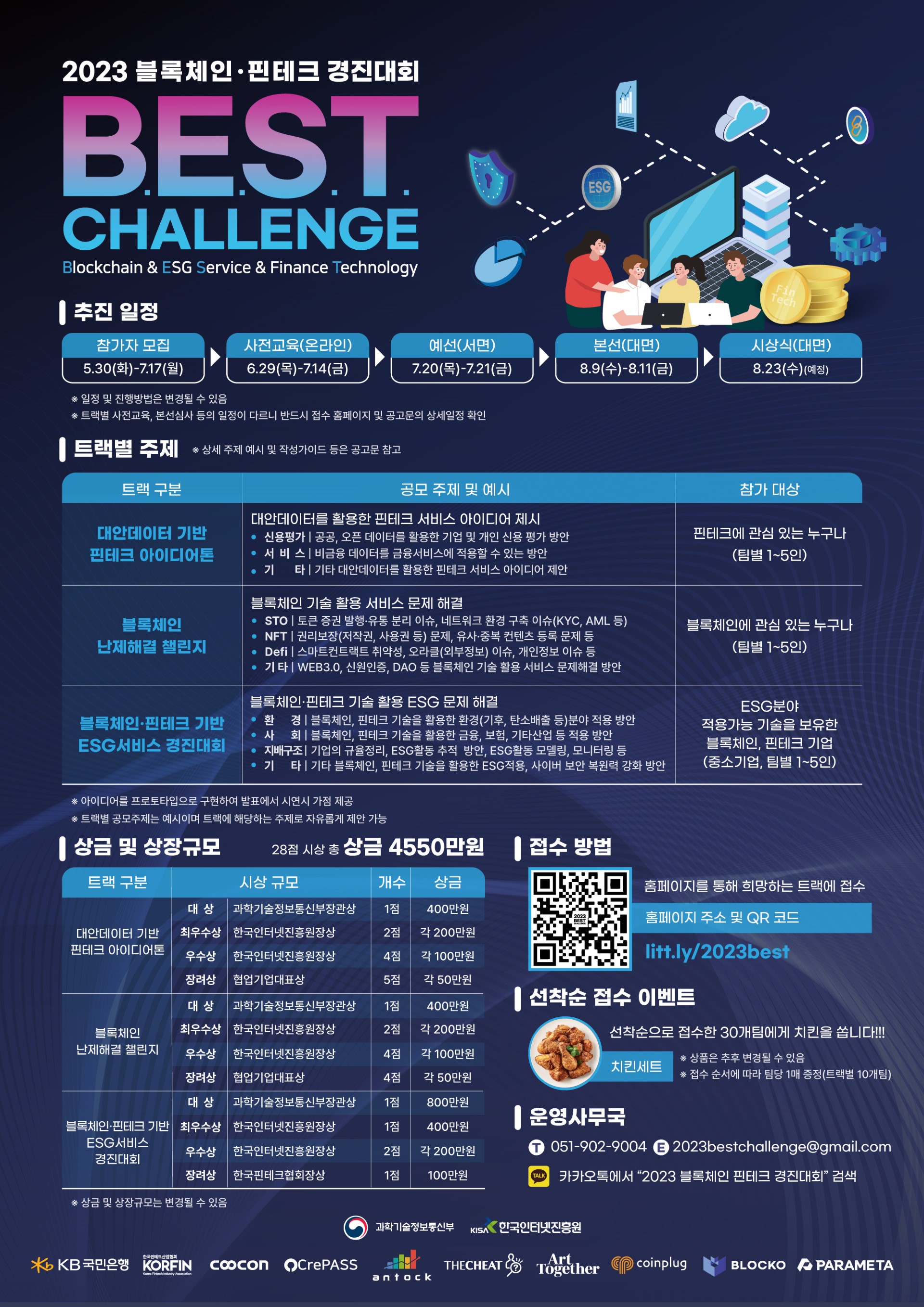 과학기술정보통신부와 한국인터넷진흥원은 블록체인·핀테크 분야의 혁신 기술·서비스와 우수 인재 발굴을 위해 아래와 같이 블록체인·핀테크 경진대회 BEST (Blockchain & ESG Service & Finance Technology) Challenge를 개최하오니 많은 관심과 참여 바랍니다. 2023년 5월 30일 주최 : 과학기술정보통신부 주관 : 한국인터넷진흥원 |