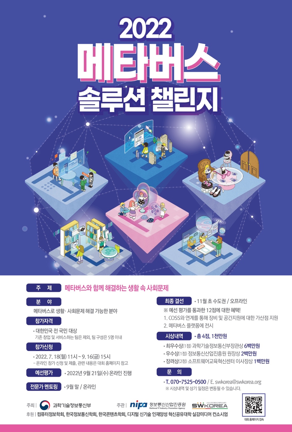 대상 : 대한민국 전 국민 대상(개인 또는 단체)** 기존 창업 및 서비스하는 팀은 제외, 팀 구성은 5명 이내 주제 : 메타버스와 함께 해결하는 생활 속 사회문제 분야 : 메타버스로 생활· 사회문제 해결 가능한 분야** 어린이의 등하교를 위한 시뮬레이션, 재난 대비 체험 시뮬레이션, 디지털 소외계층을 위한 디지털 교육 등 자유주제로 공모 진행 ▶ 참가 신청 방법 7. 18(월) 11시 ~ 9. 16(금) 15시 – 온라인 참가 신청 및 제출, 관련 내용은 대회 홈페이지 참고 (http://2022ictchallenge.kr/)※ 접수 마감 후 팀원 변경은 절대 불가(충원/감원 모두 불가 : 수상 시 팀원 전원 서명 必) 1). 서비스 기획서(HWP) : 홈페이지 공지사항에서 다운로드! 2). 서비스 설명영상(MP4) : 발표 영상 제출(5분 이내) 3). 서비스 소개자료(PPT) : 형식은 자유, 서비스에 대한 상세 설명, 폰트 포함 저장-> 개발 심화계획, 홍보 및 마케팅 계획 포함 4). 솔루션 개발 결과물을 확인 할 수 있는 자료(ZIP)※ 개발 산출물*, 데모 영상, 개발 링크 등 구현이 가능한 솔루션 자료 -> 솔루션 검증에 있어 참고할 만한 자료 선택 제출 가능 개발 산출물*: ①기존 메타버스 플랫폼 활용, ②유니티 등을 활용하여 개발된 메타버스·ICT 솔루션 제출 ▶ 대회 일정 1. 예선 평가(온라인 진행) 2022년 9월 21일(수) -> 2022년 9월 23일(금) 발표 예정 팀 별 제출된 자료를 바탕으로 우수 팀 최대 12팀 선정 ‘기획의 적합성’, ‘사회적 가치창출과 효과성’, ‘우수성 및 차별성’, 기술적 완성도 또는 완성 가능성‘ 등을 전반적으로 평가하여 결선 진출 팀 선발 2. 전문가 멘토링(9월 말 / 온라인) – 예선 평가에서 선발 된 우수 12팀 – 약 2주간의 전문가 멘토링 과정을 거쳐 솔루션 보완 및 고도화 3. 최종 결선(11월 초 / 수도권 / 오프라인) – 우수 12개팀이 모여 최종 결선 진행 – 최종 완성된 솔루션에 대한 평가로 심사/우수팀 선정 – 타 대회 또는 프로그램에서 수상한 아이디어는 심사에서 제외됨(결선 종료 후 확인 될 경우 수상 취소) ※ 위 내용은 추후 변경 될 수 있습니다. ▶ 시상내역