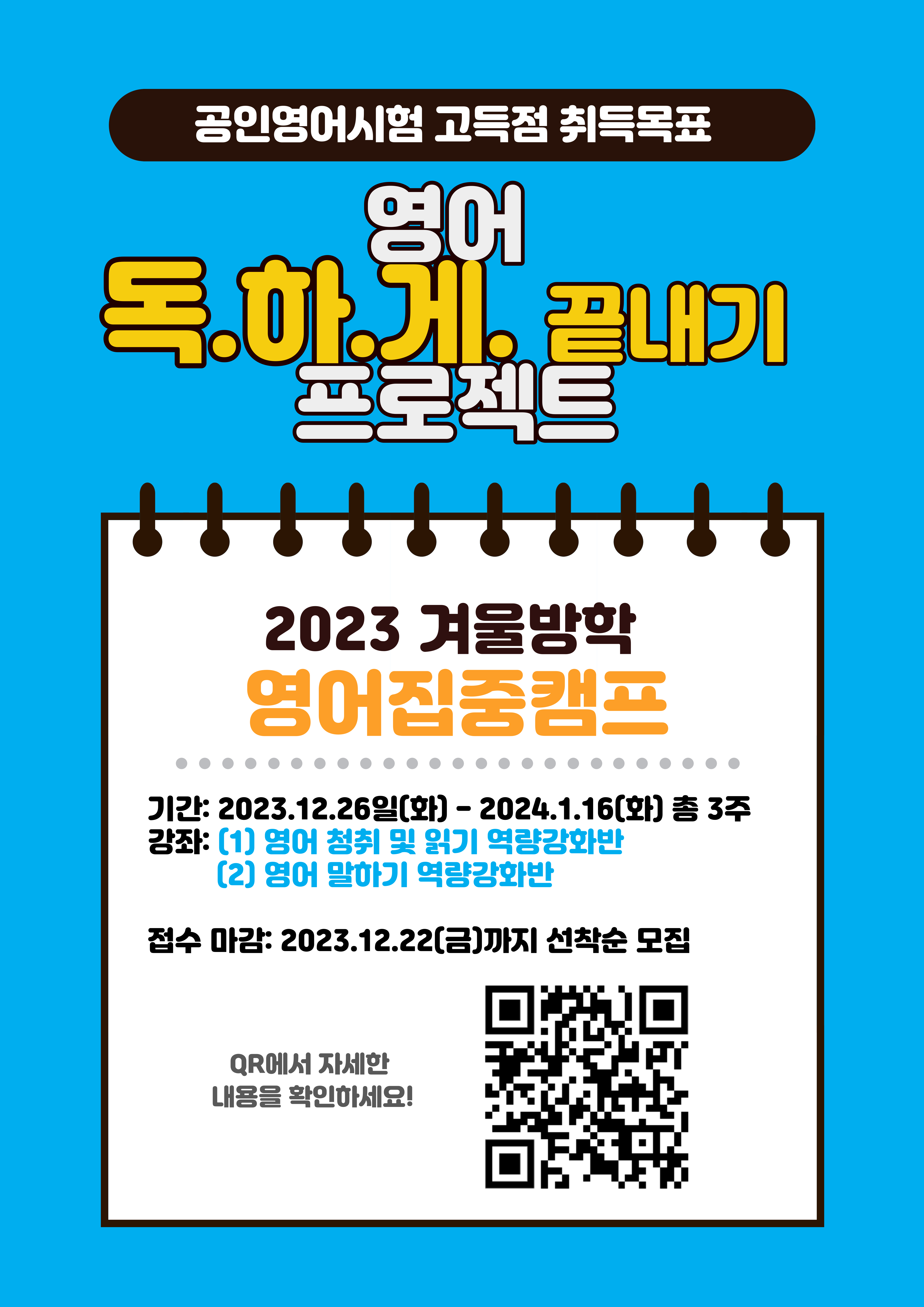 1) 신청방법: 2023.12.22(금)까지 아래의 링크를 통한 온라인 선착순 접수(단, 수강인원 초과 시 2023학년도 모의토익 기응시자 우선 선발)